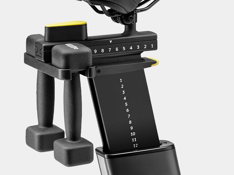 Odradite trening za cijelo tijelo dodavanjem vježbi snage u svoju kardio rutinu. Nagibna konzola osigurava najbolje iskustvo praćenja ekrana iz bilo kojeg položaja .