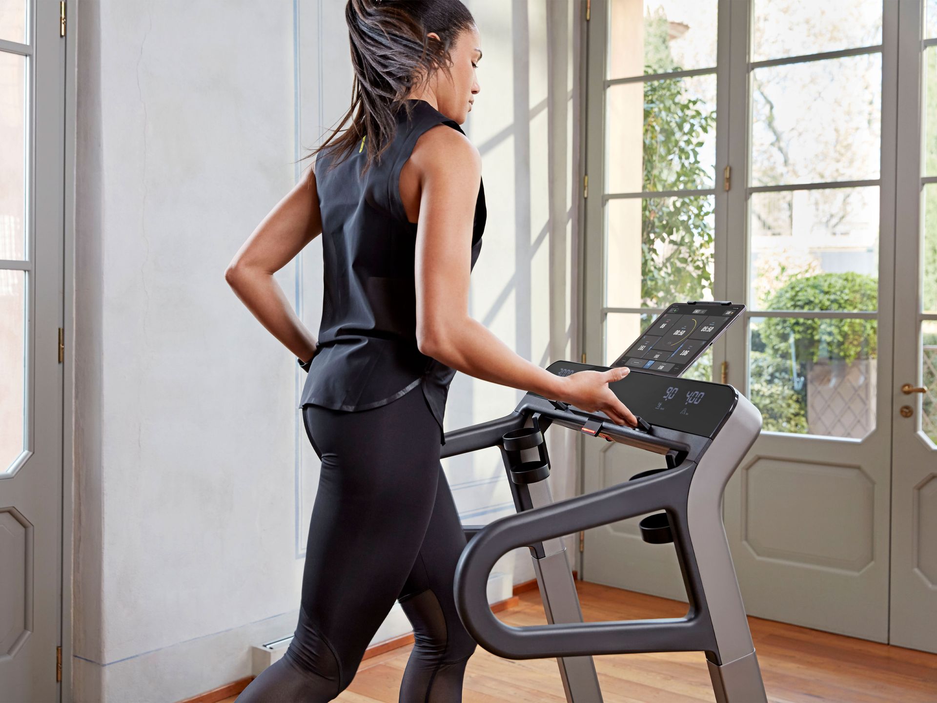 Jednostavno uključite Bluetooth® na svom tabletu, postavite ga na ekran MyRun trake i pokrenite Technogym Live aplikaciju. Kada odaberete trening, pojaviće se opcija za povezivanje sa opremom: sada možete izabrati svoj MyRun.
